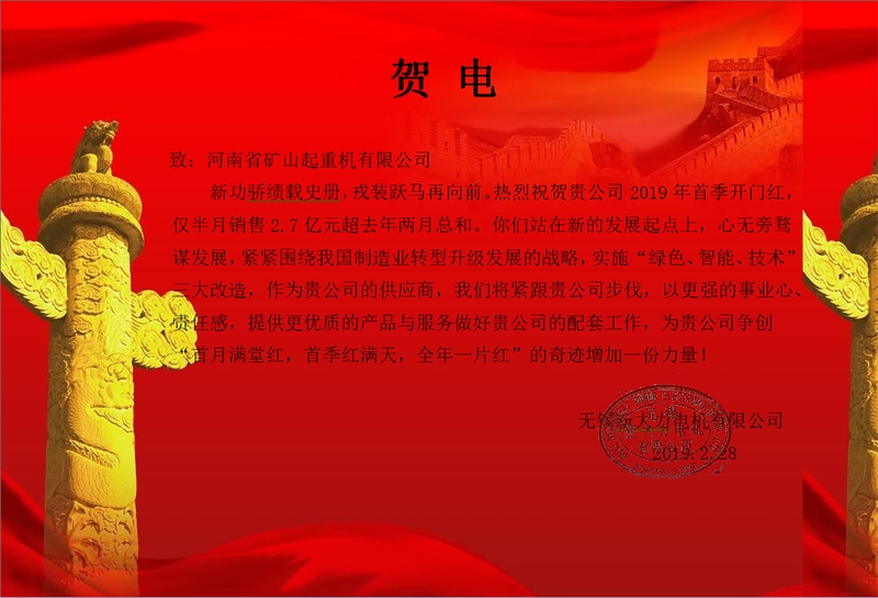 河南礦山首季開門紅,訂單多、生產(chǎn)如火如荼。各大供應(yīng)商紛紛來函來電,祝賀公司取得了2019年首季開門紅,并表示河南礦山所用原材料優(yōu)先供給,所供產(chǎn)品保質(zhì)、保量、按時(shí)送貨,確保河南礦山大生產(chǎn)如期進(jìn)行。